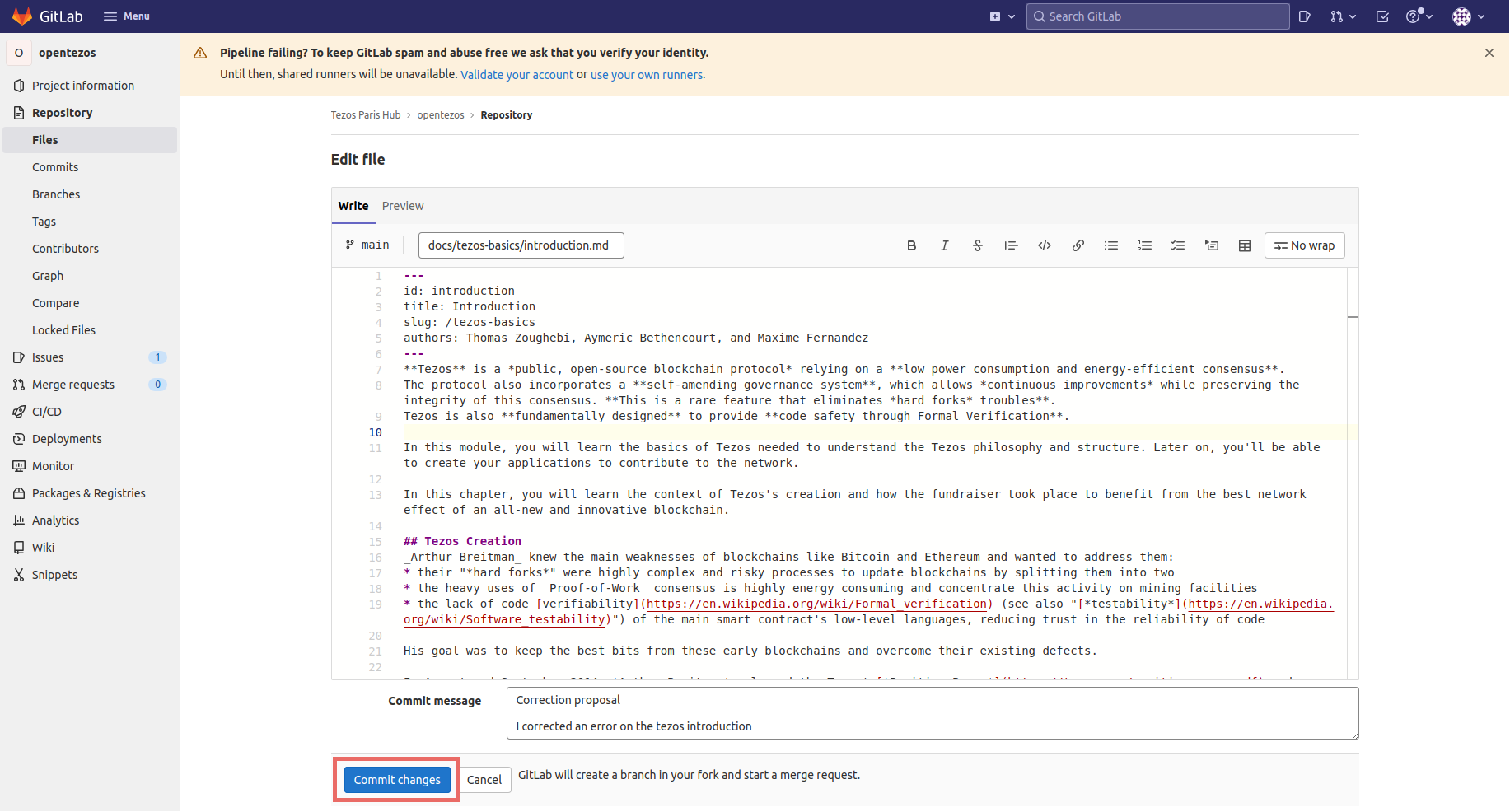 section. Enter a title and a description of your correction proposal, then clickCommit changes