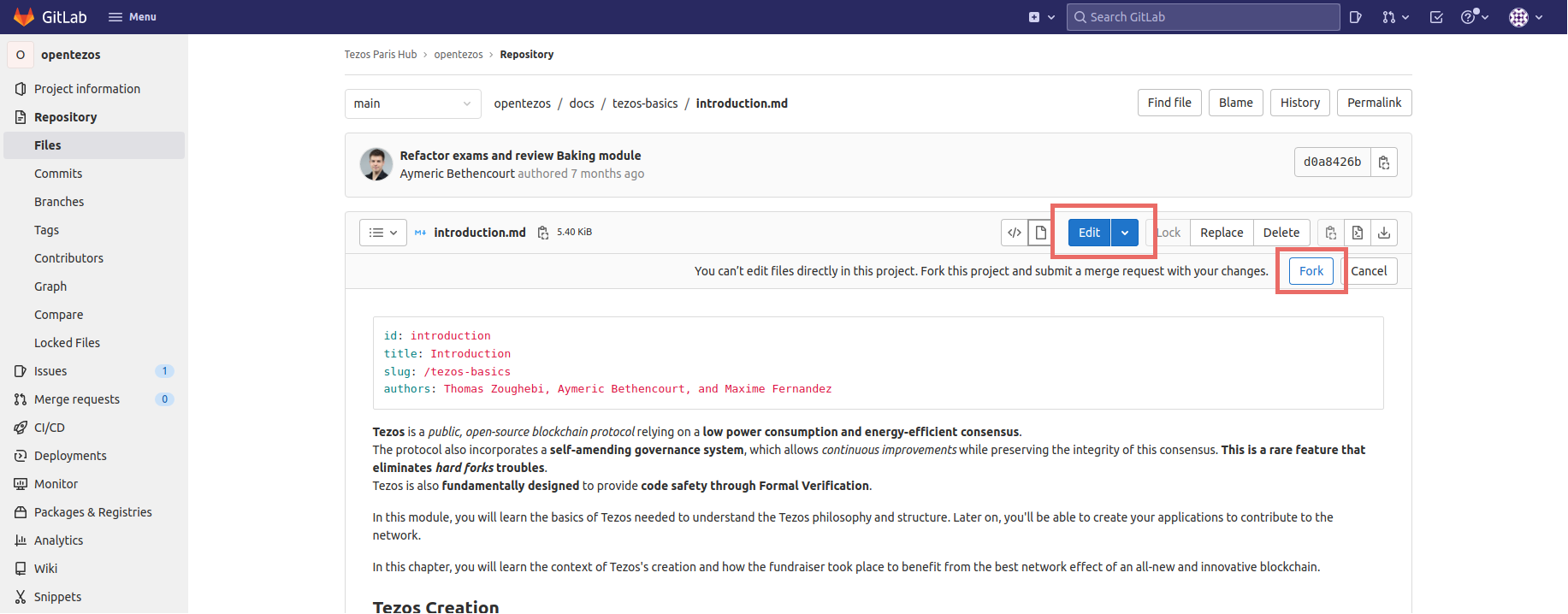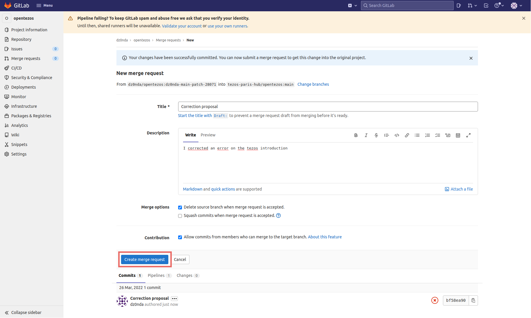 , i.e., propose your changes to the admins of the OpenMavryk repository. ClickCreate merge request