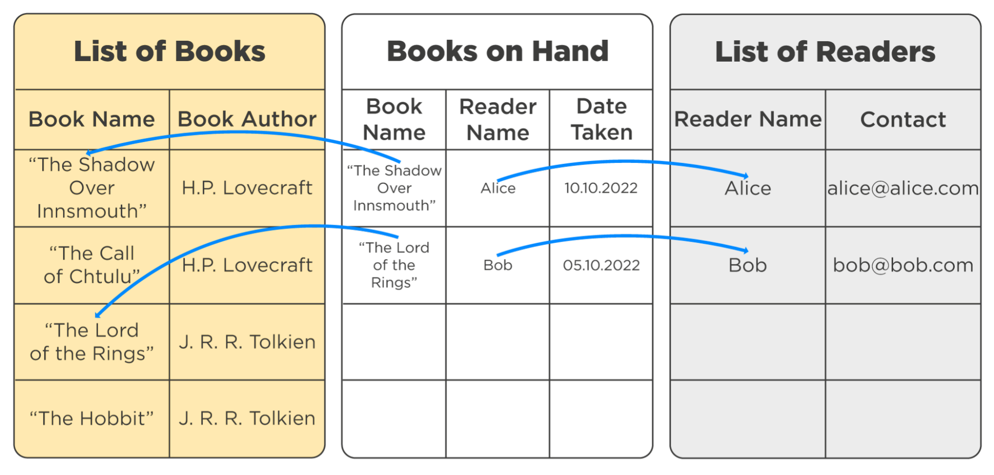 - Books on hand. A list of books that someone borrowed to read. The cell with the book's title refers to an entry in the List of books, and the cell with the reader's name refers to an entry in the List of Readers.