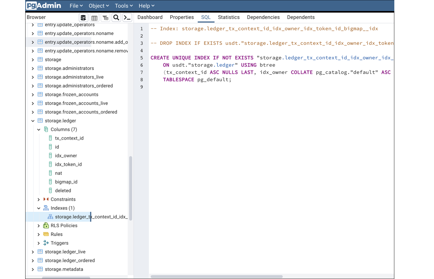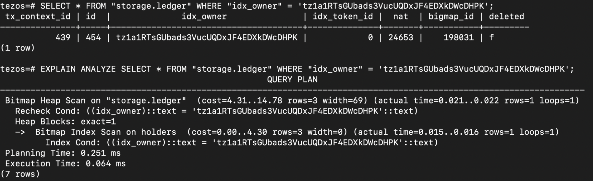 The exact list of tables, indexes schemas, and command syntax depend on the indexer and database it uses. While using MvKT, a query for a USDT balance will look like this: