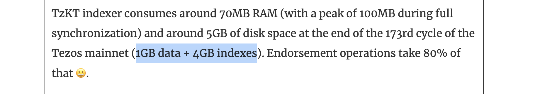 The more unique columns we want to use for a search in the database, the more indexes we have to create for efficient searching, and they take up space. In 2019, Baking Bad revealed that indexes for their 1GB database of Tezos blockchain data take up four times as much space.