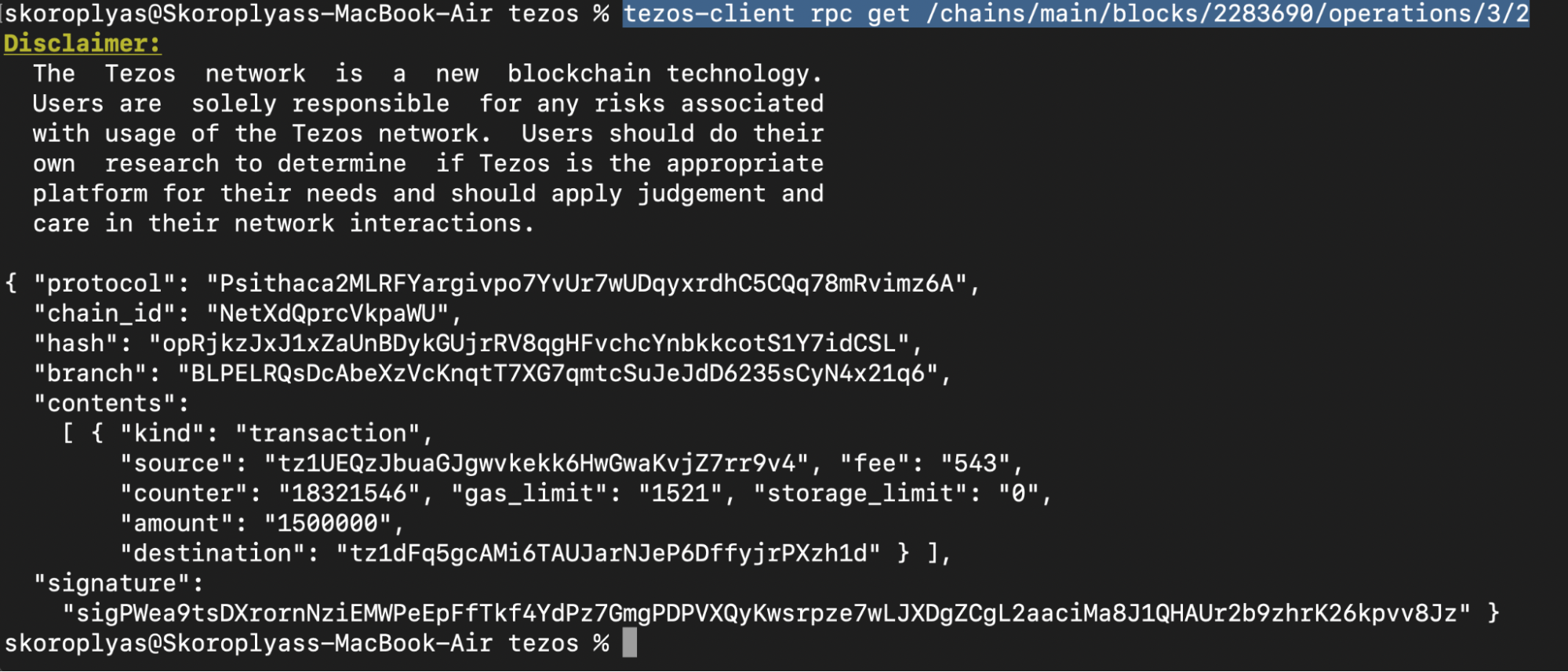 Let's try to get data about the transaction using Tezos client and RPC API — opRjkzJxJ1xZaUnBDykGUjrRV8qgHFvchcYnbkkcotS1Y7idCSL.