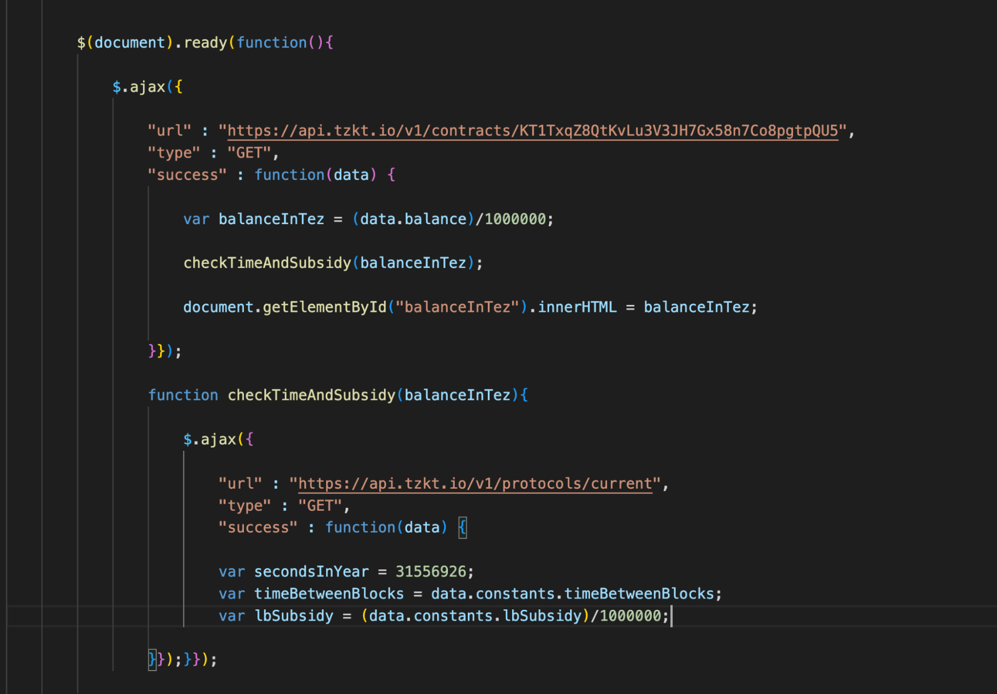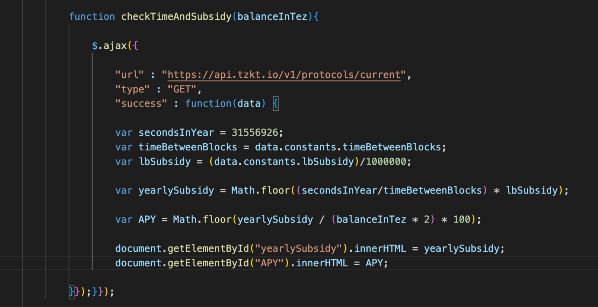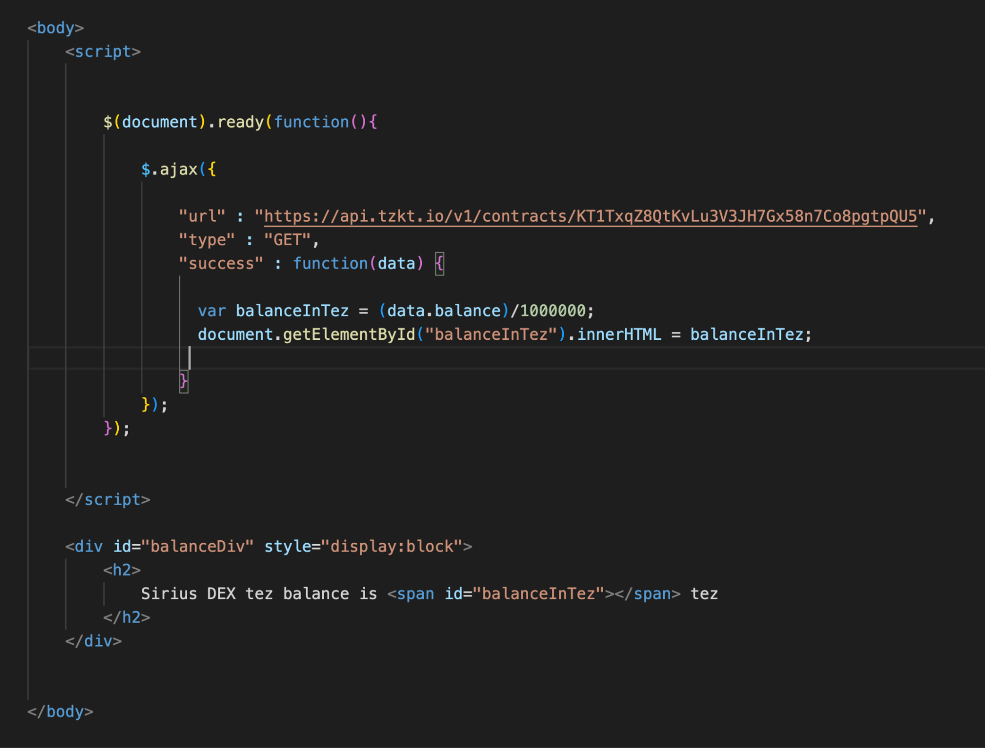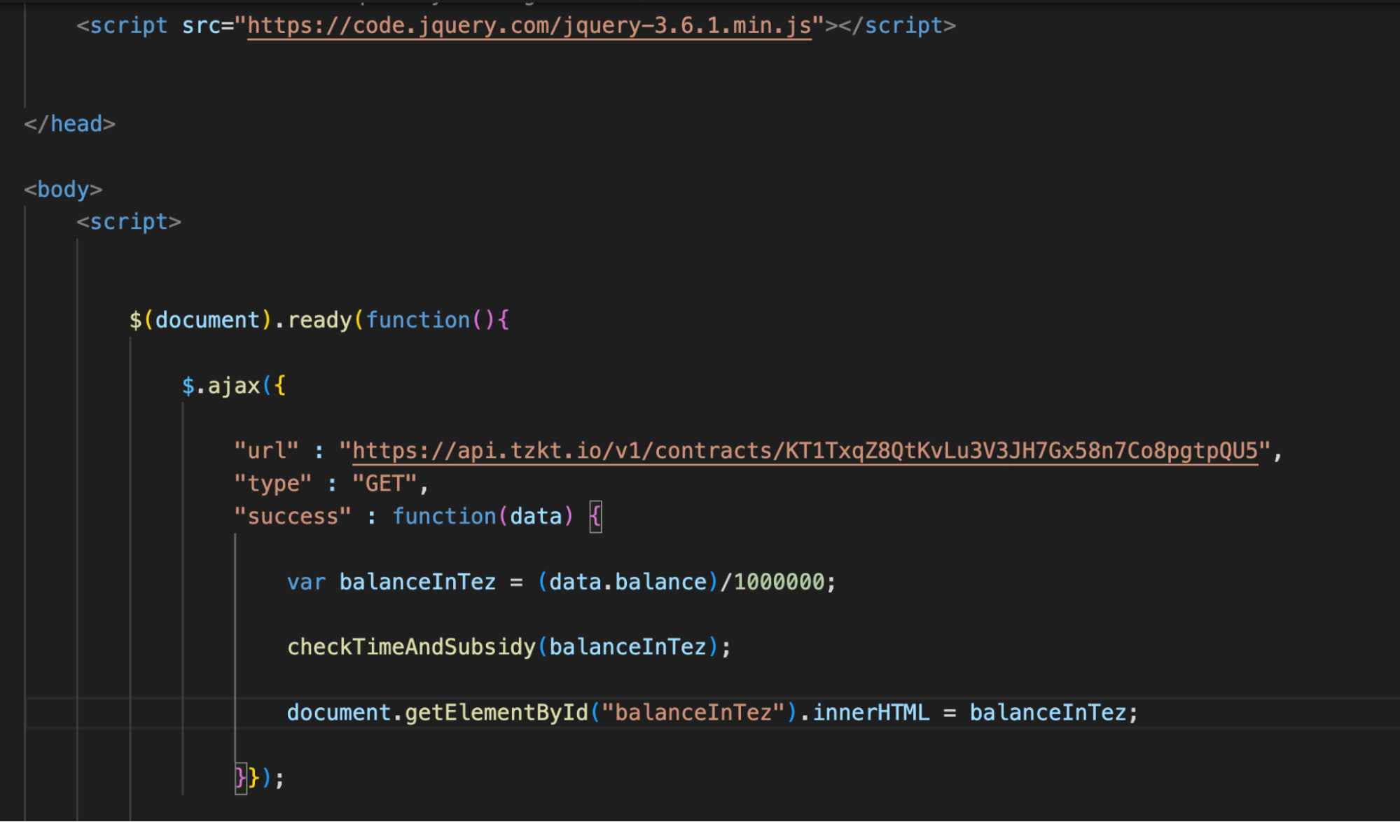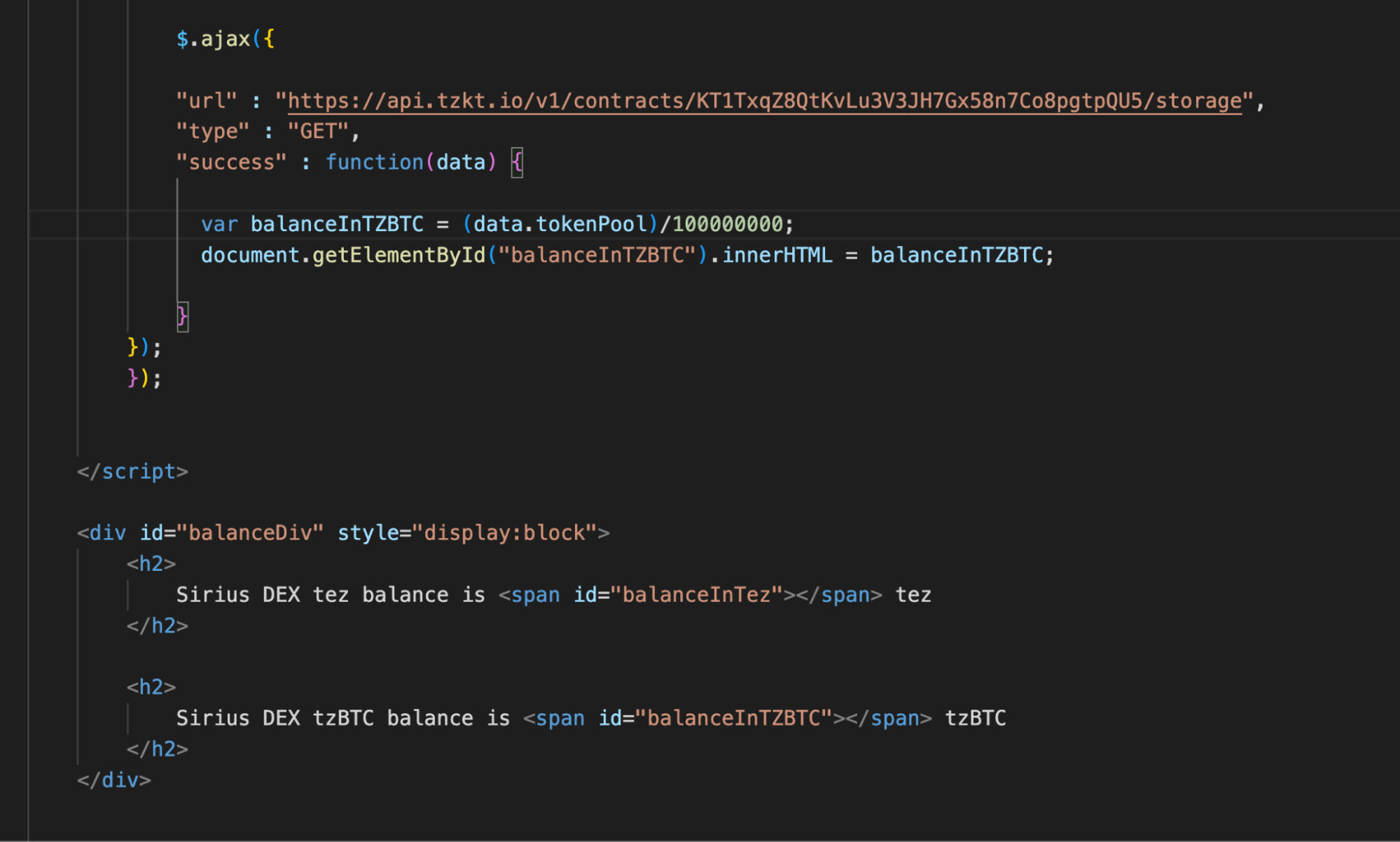 Now we should create another AJAX request. In the URL, we specify the API request for the storage content and assign the value of the corresponding entry, tokenPool, to the balanceInTZBTC variable.