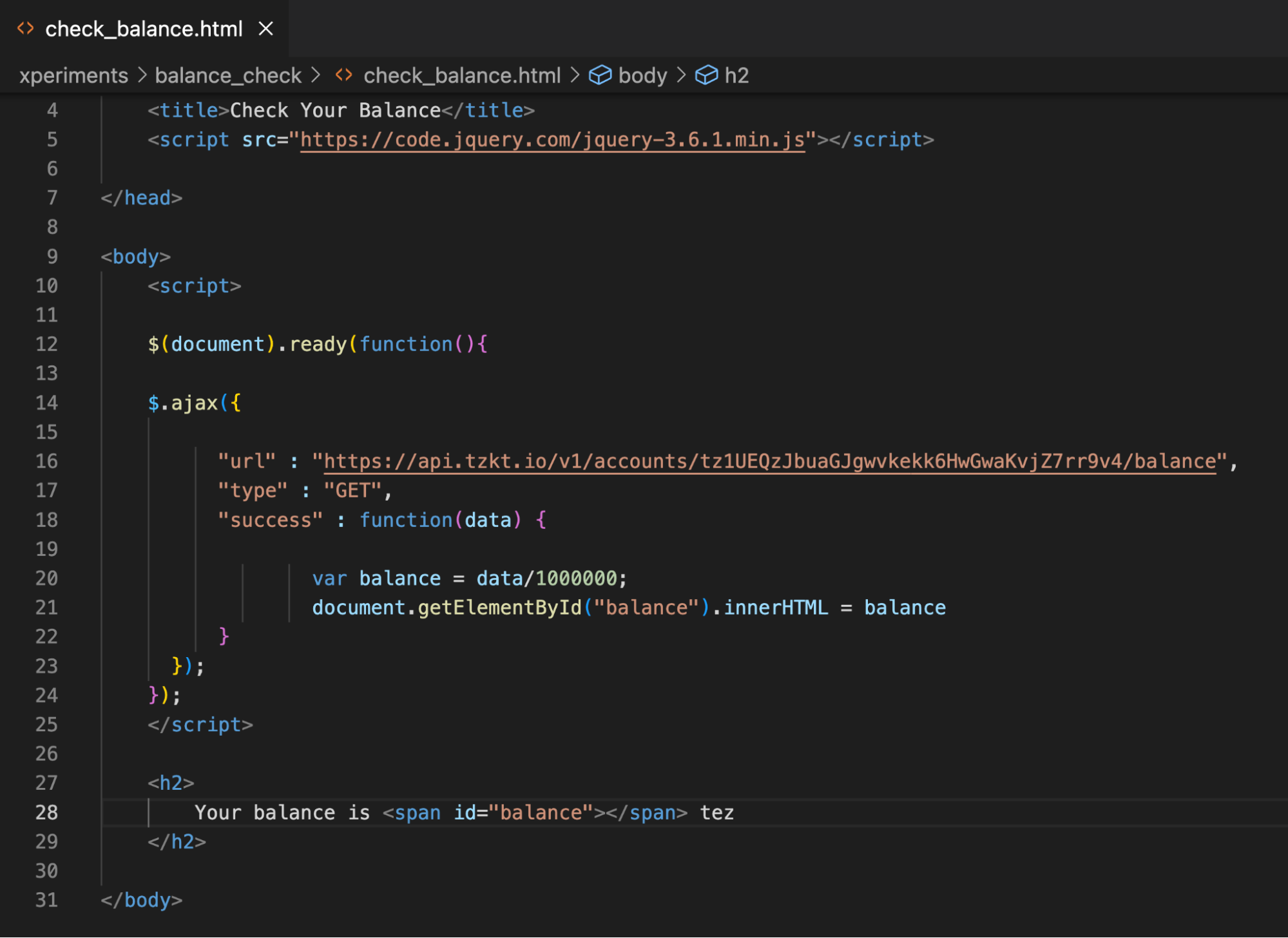 In the end, we will add a h2 element, in which we will display the balance. To display the variable's value, we use the span element and the id previously assigned to the balance variable.