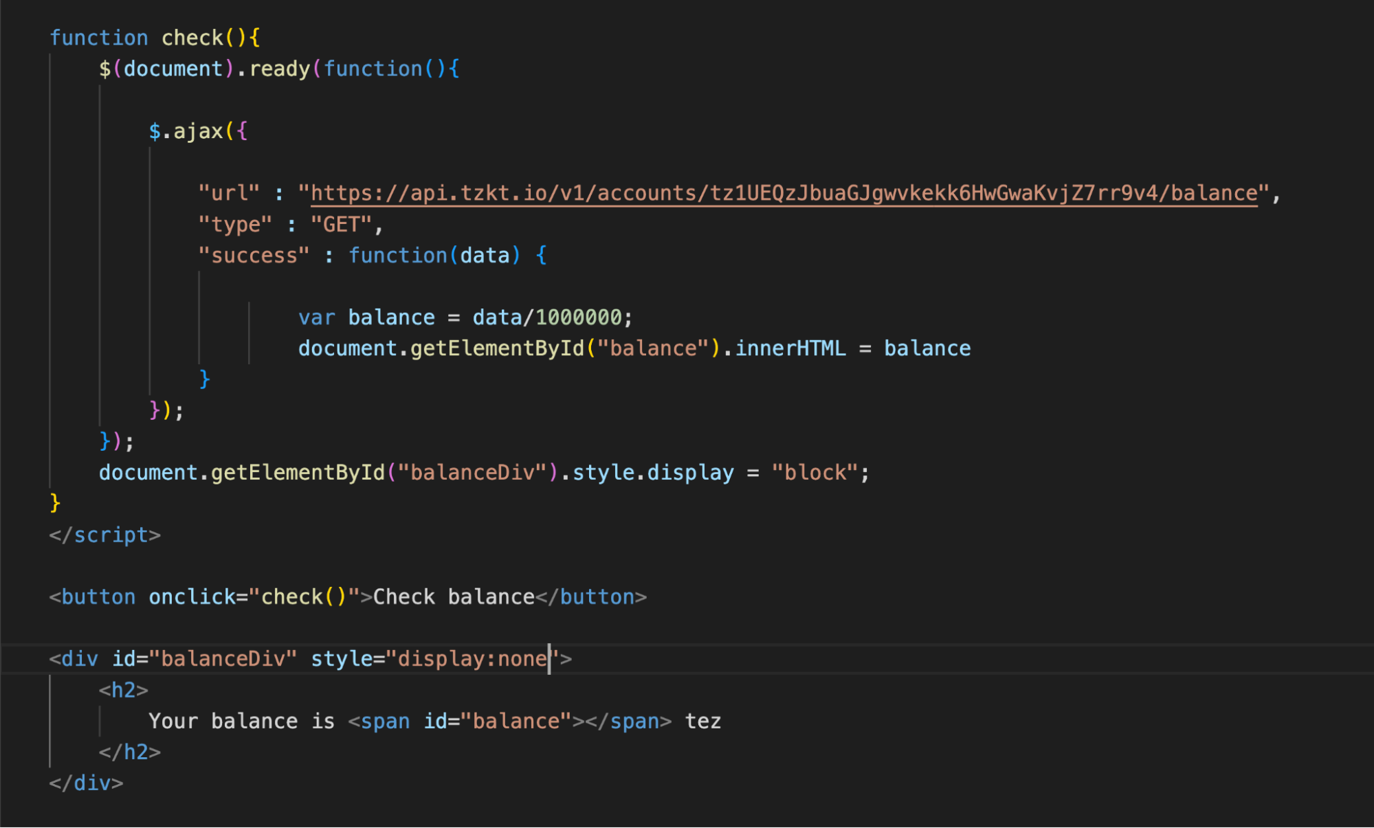 Let's create a button and add a call to the check function to it, in which we will place the entire request code. At the end of the function, add a change in the display style of the div to a visible block.