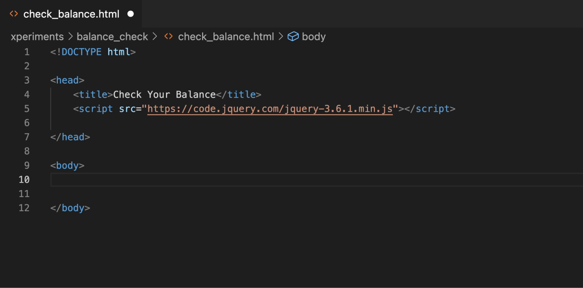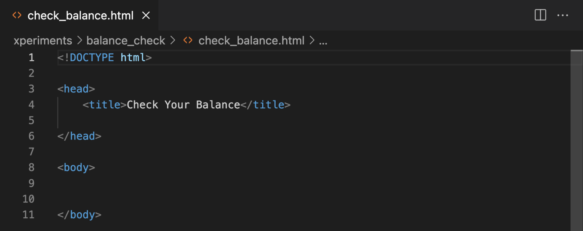 First, let's create an empty HTML file in VS Code (you may use another editor, of course) and add the essential elements: doctype, head, title, and body.