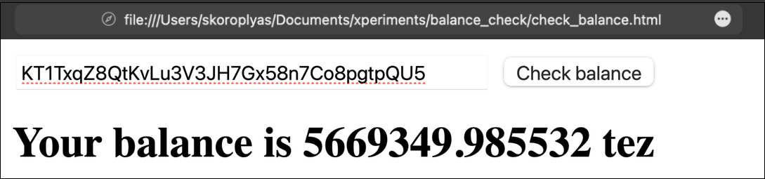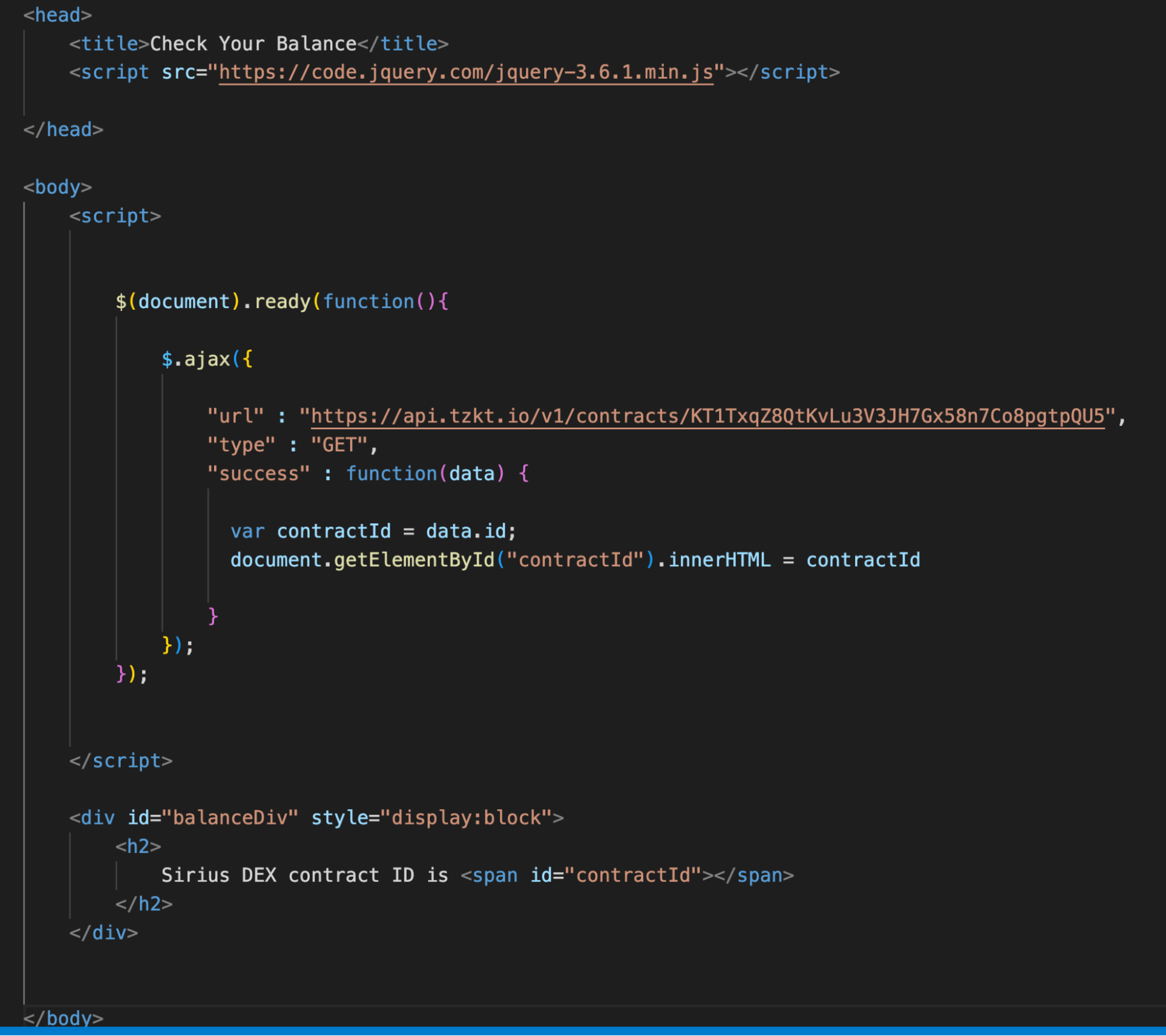 Let's copy the code of the first example and remove the button and the field for entering the address from it. Let's replace the API request URL with https://api.mvkt.io/v1/contracts/KT1TxqZ8QtKvLu3V3JH7Gx58n7Co8pgtpQU5 to get information about the contract from the indexer.