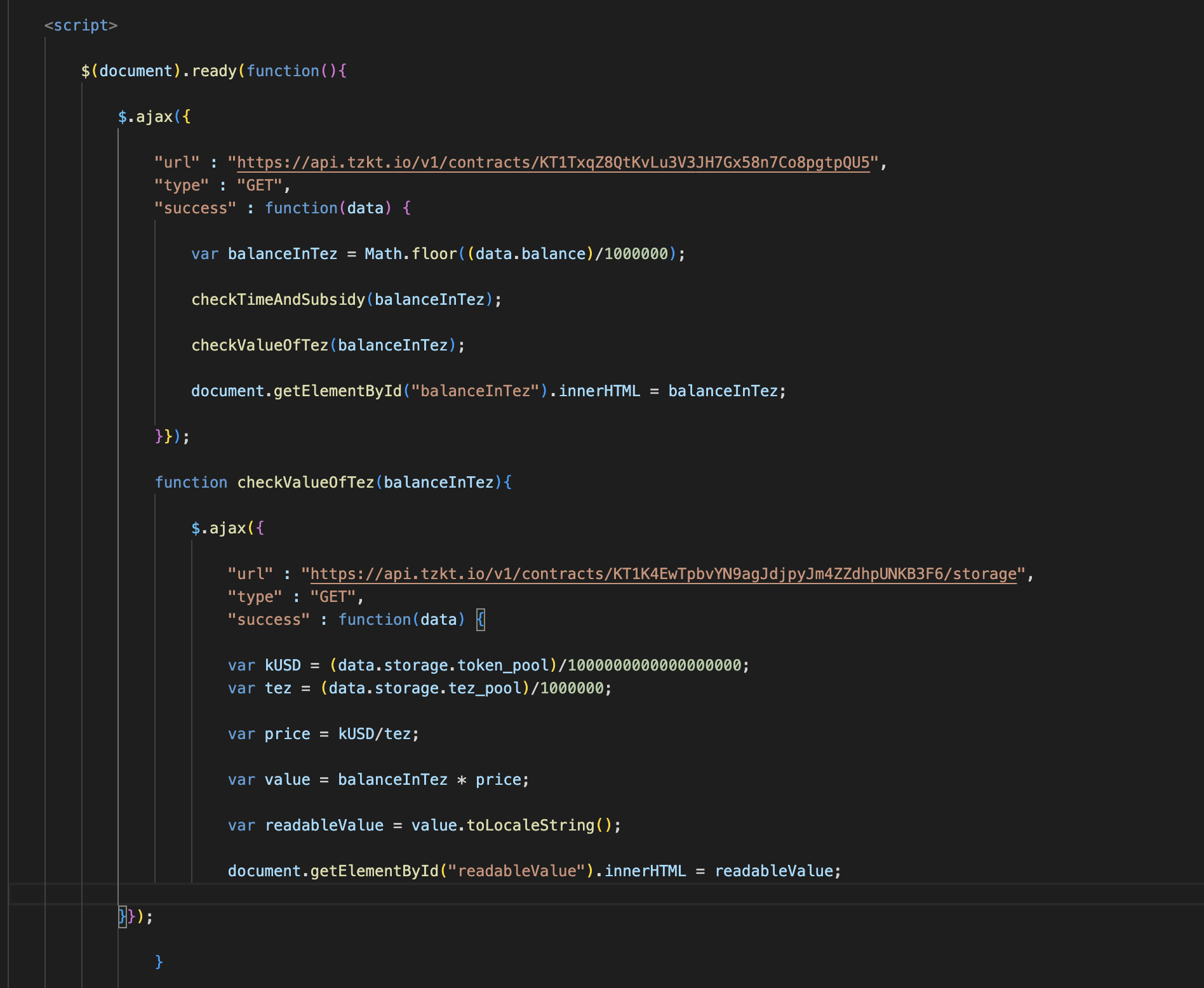 Since we need to know the number of mav in the pool to calculate the cost of all mav, we need to use nested functions. After receiving the balanceInMav variable, we call the checkValueOfMav function with the balanceInMav argument. In this function, we use AJAX to get data from the mav/kUSD pool (remember to divide the number of tokens depending on the required number of zeros!)