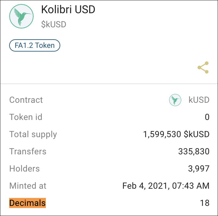 And we need to remember that the token's amount in the contract's storage is a natural number. And to display the actual amount of tokens, we need to divide that nat by the corresponding number of decimals written in the contract's metadata. For example, kUSD has 18 zeros after the decimal point, and when we get raw token amount data, we need to divide it by 10^18 to get the actual amount.