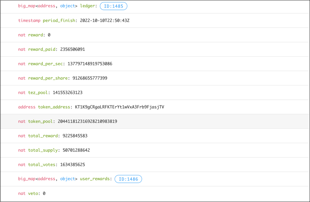Now we need to get the amount of wBTC. Let's examine the storage of the liquidity backing contract on MvKT: it shows the amount of wBTC under the tokenPool key. You can access it by requesting the contents of the storage.
