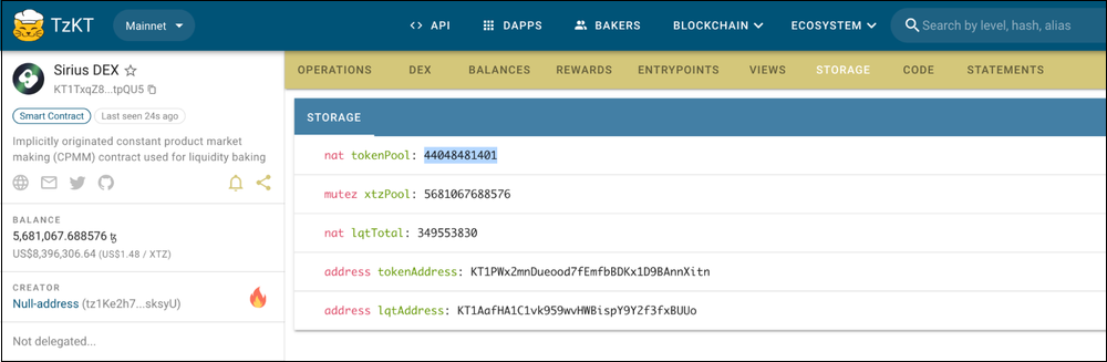 First, check the mav/kUSD contract on an exchange on MvKT. Then examine the storage and find the necessary keys: mav_pool is the amount of mav, and token_pool stands for the amount of kUSD.