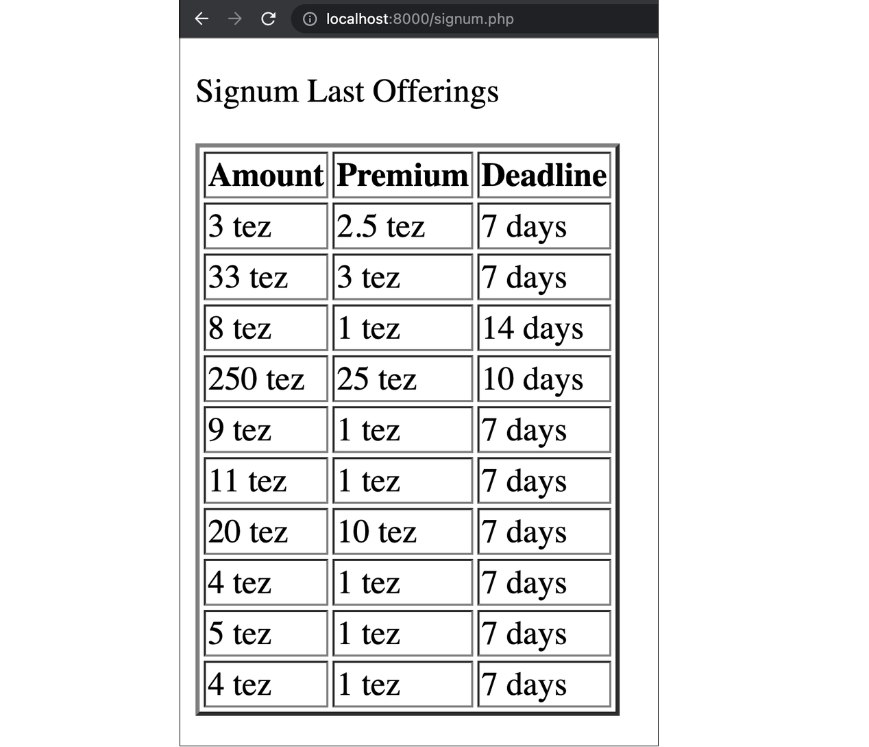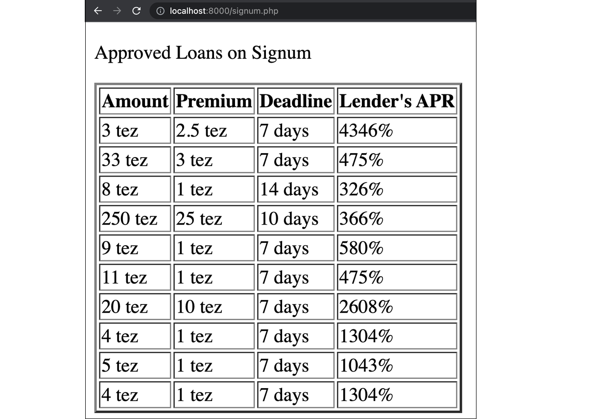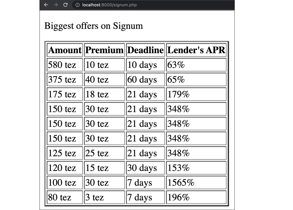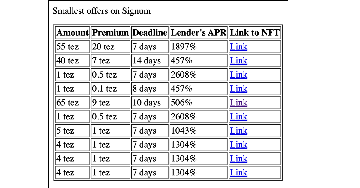 Full indexing of all smart contract transactions may take several days. So for the following example, we will use the contract of the NFT-lending service Signum. This dApp lets users take loans in mav using their NFTs as collateral. We can index its contract storage and entry points calls and then use SQL to filter contents, for example, to show the biggest approved loans or offers with the highest APY for lenders and even generate links to collateralized NFTs.