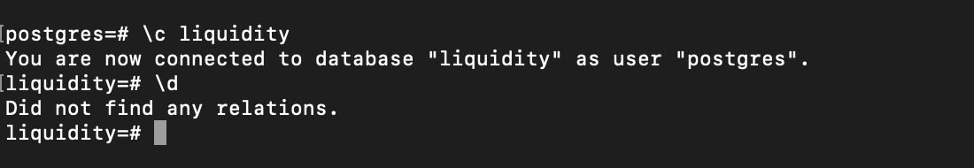 Postgres uses the \d command and its derivatives to view the contents of tables in a database. Let's try to do it. First, connect to the liquidity database with \c liquidity, then execute \d.