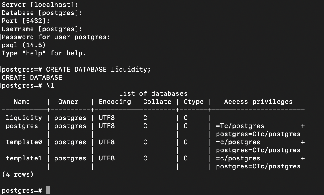 The Access Privileges column opposite the liquidity database is empty, so you need to give the postgres (or the username you picked) user the right to work with it. To do this, run the command: