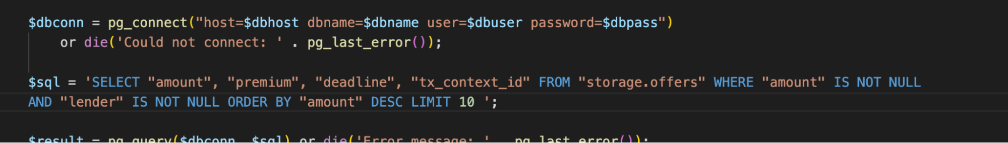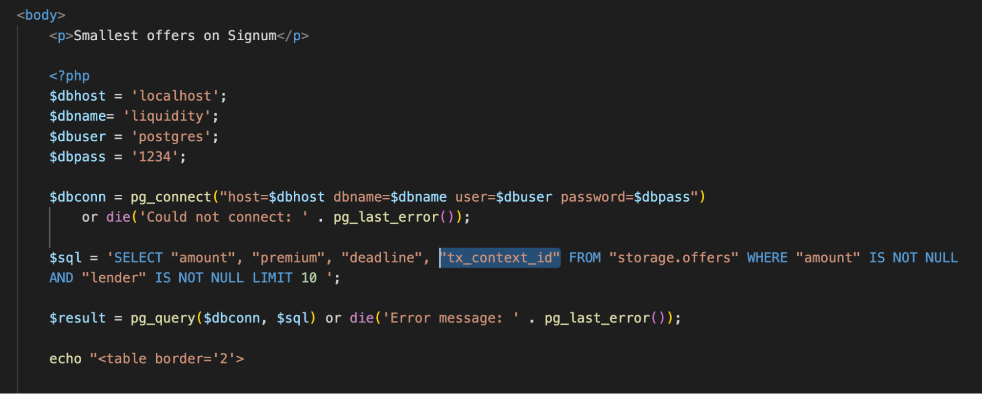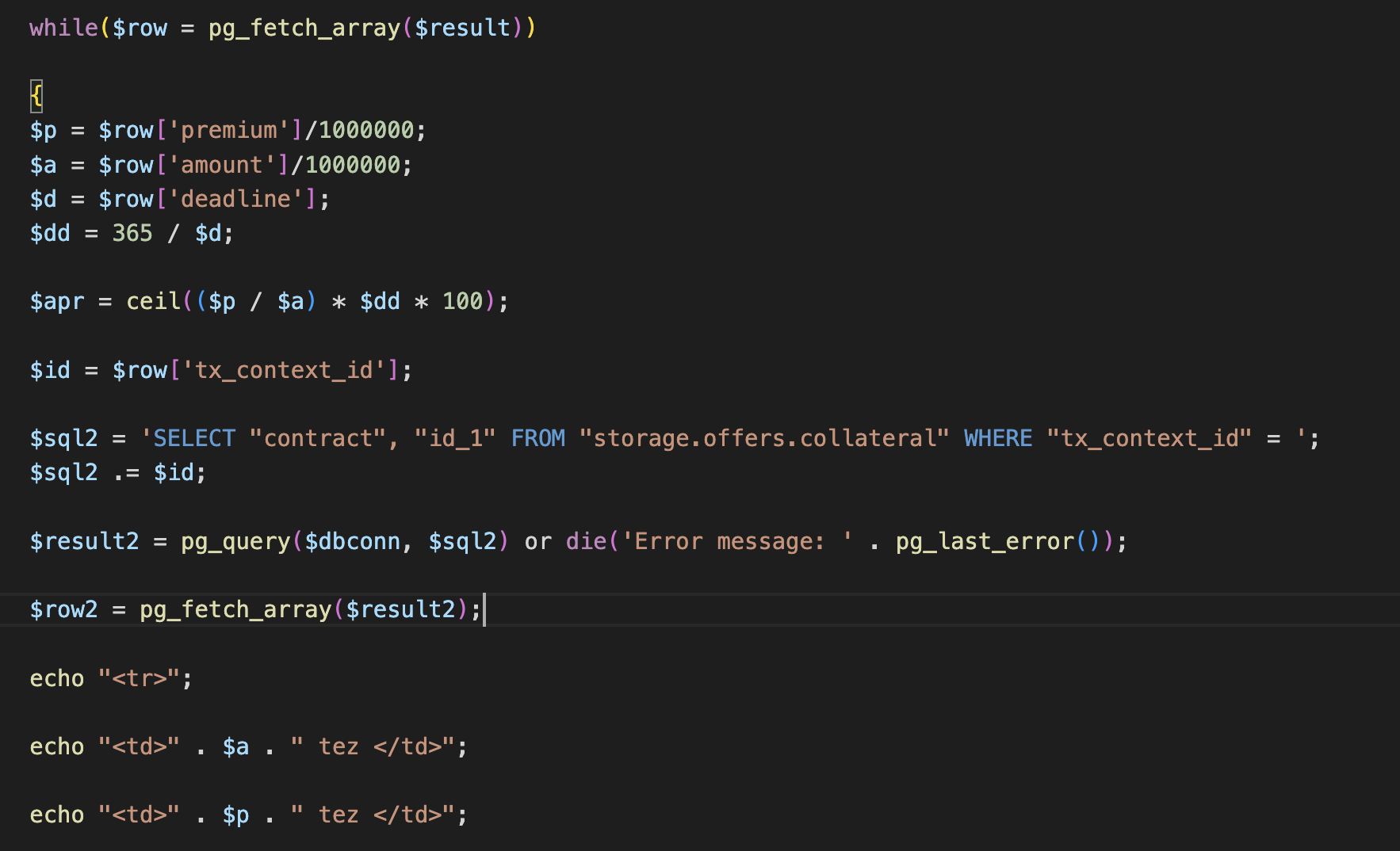 In the while loop, add the $id variable, to which we will assign the value tx_context_id. Then we will write a $sql2 SQL query that will request the contract address and token id from the storage.offers.collateral table with the same tx_context_id values that we got from the first query. In the end, we execute the query with the pg_query() function and write it to the $row2 variable.