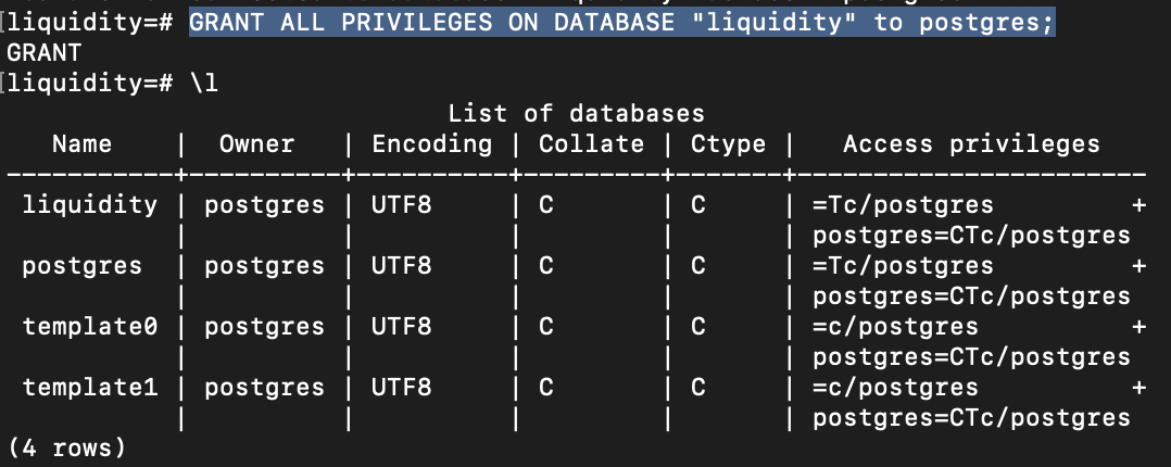 GRANT ALL PRIVILEGES ON DATABASE "liquidity" to postgres;