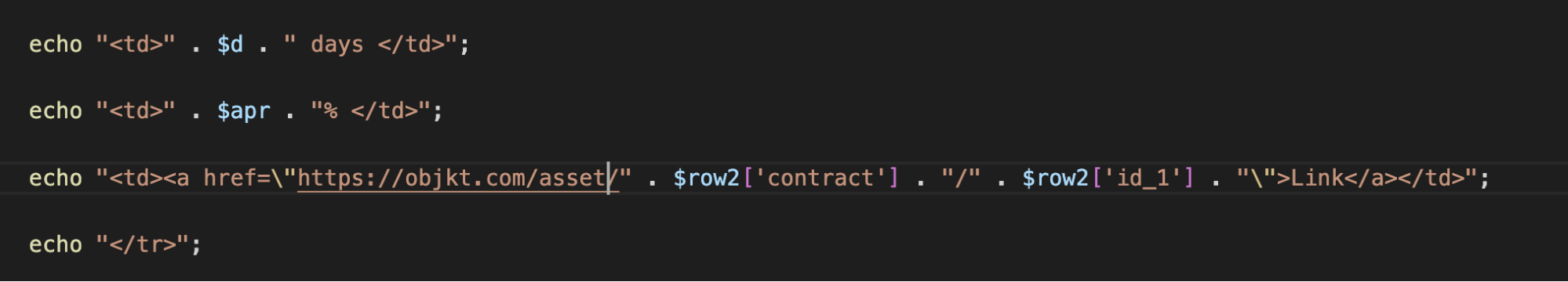 - Change the link to MvKT in the table to a link to Objkt.com. To do this, study the structure of the NFT link on Objkt.com and edit the link in the table.