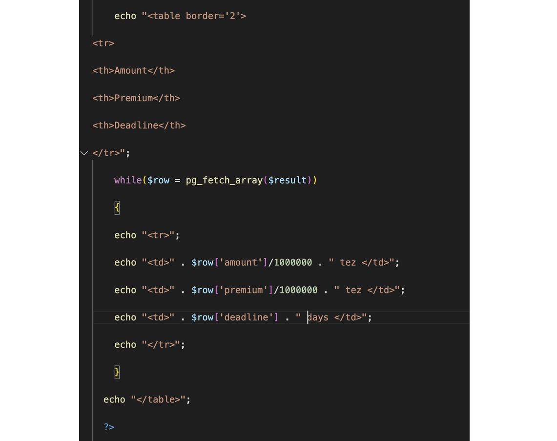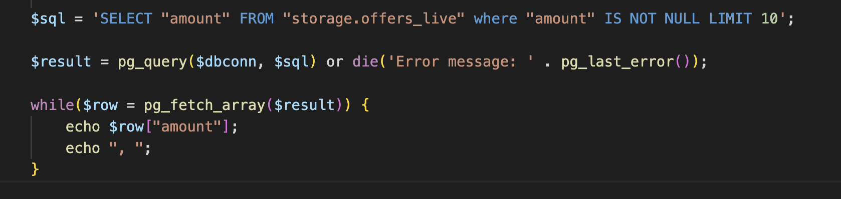 Let's see the result at the end. Since pg_query() will return the data as a series, we use a while loop and the pg_fetch_array() function to fetch all the elements into an array and display them individually. First, assign to the $row variable the result of the pg_fetch_array() function execution on the final result. Then, in a loop, we will output each element of the $row["amount"] array using the echo command and separate the elements with a comma and a space (", ").