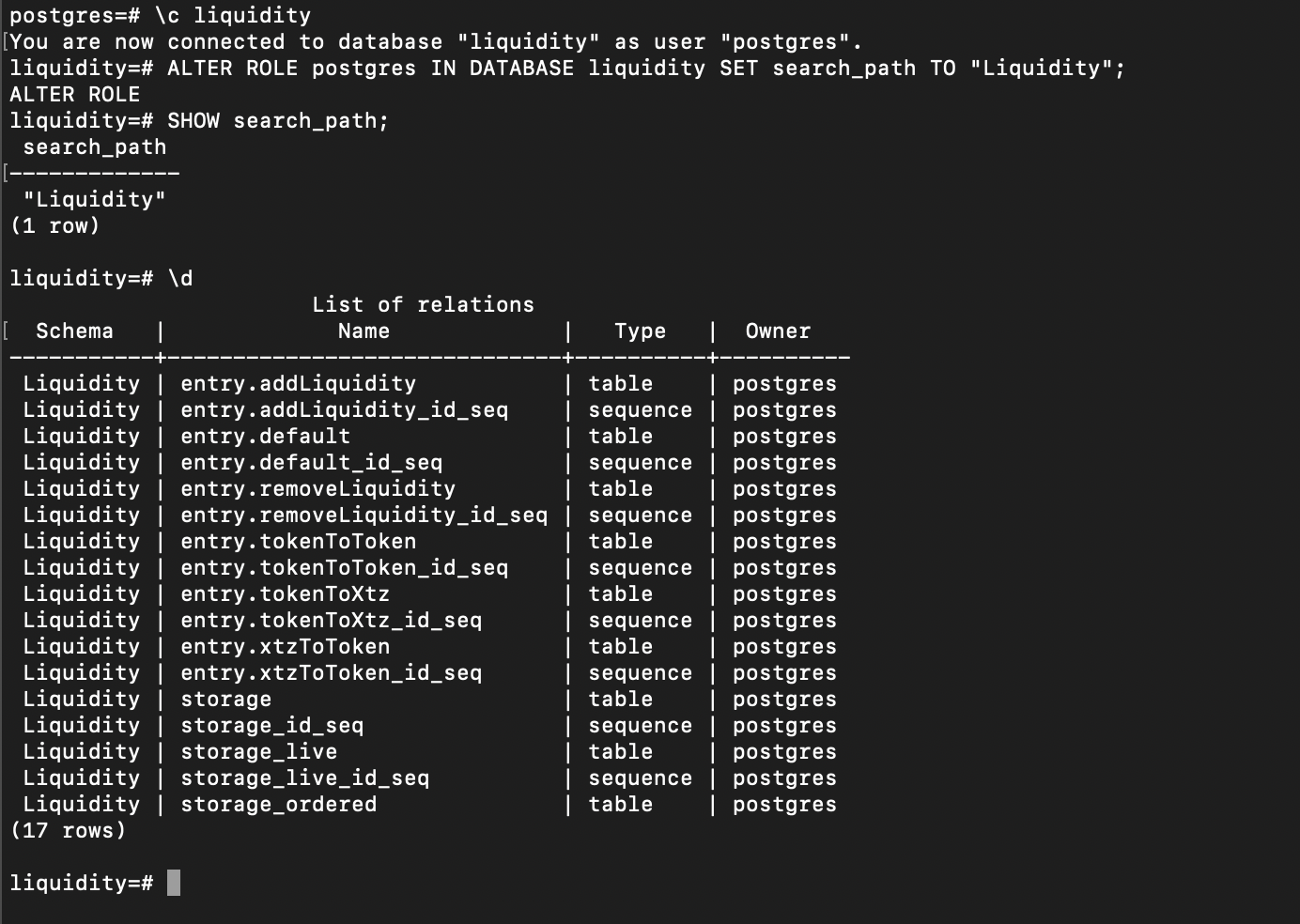 This will force Postgres to look up data in the liquidity database using the "Liquidity" schema. Sounds complicated, but in the end, \d will display all tables and their relationships.