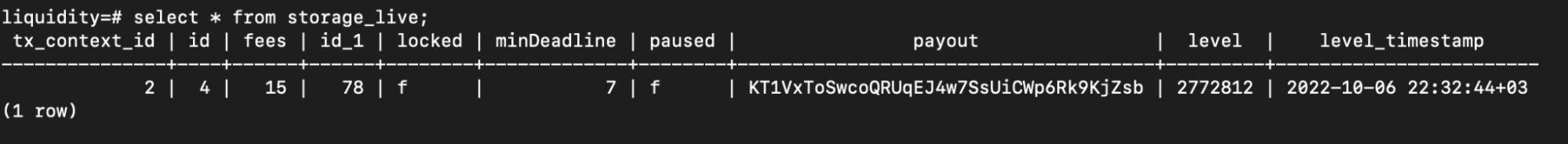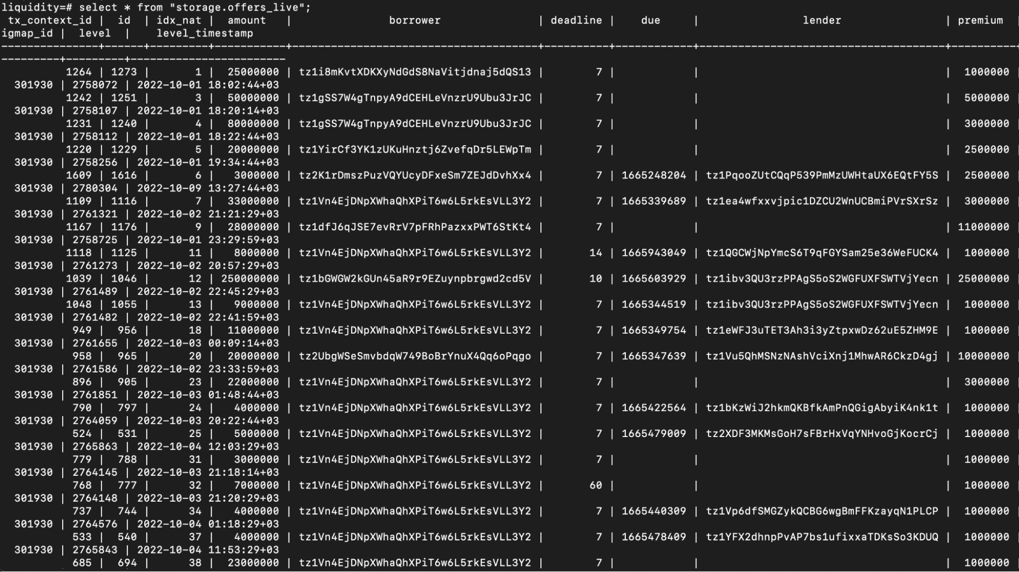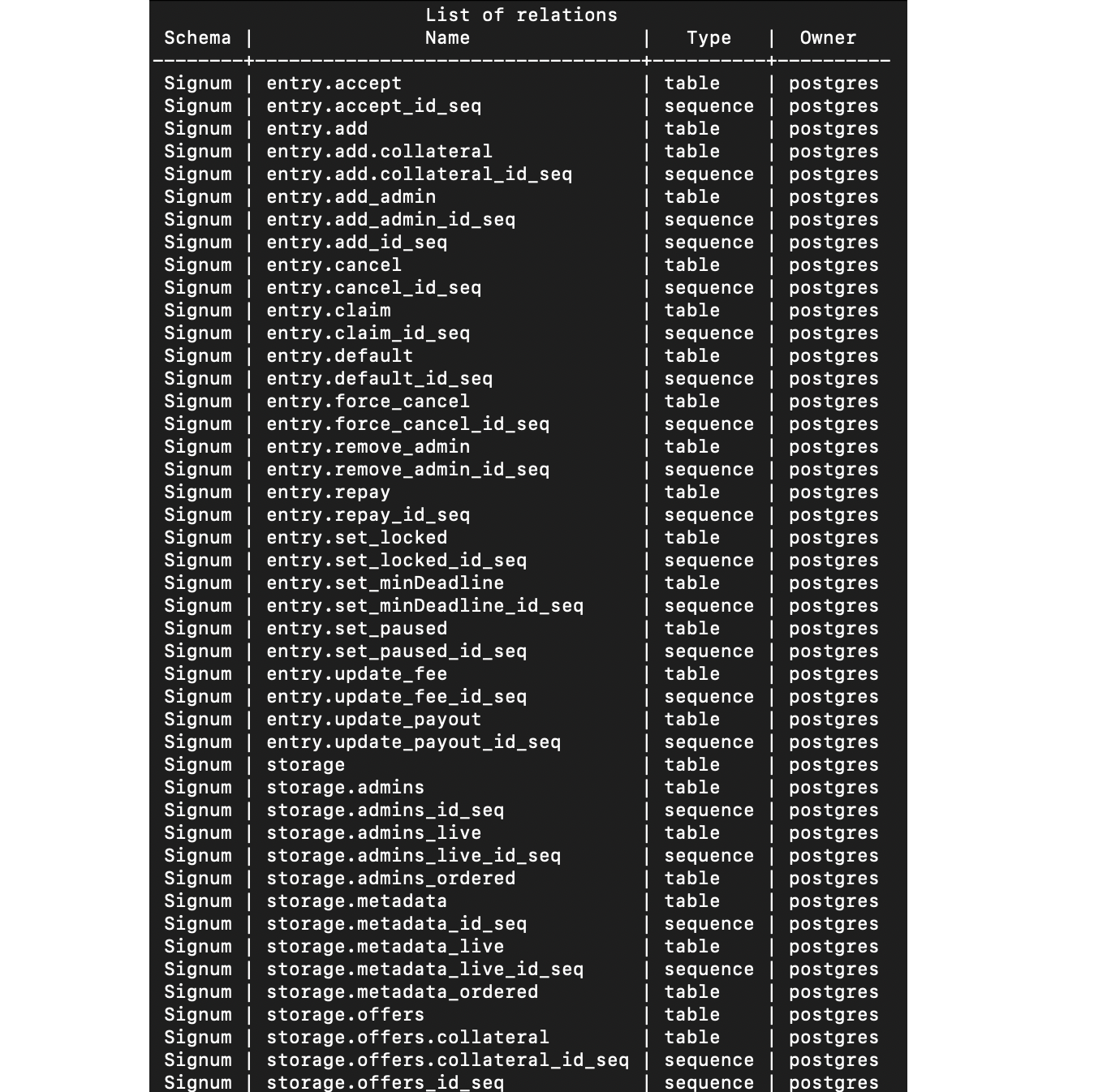 In our tutorial, we will use two tables; "storage_live" and "storage.offers.collateral". The first one contains data about all offers written in the Signum contract, like borrower address and loan amount. The second is a list will data about offered NFTs related to offers via internal IDs.