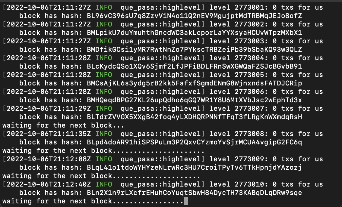 Complete indexing of data from all blocks can take several hours or even days. We will only use the data from a few thousand of the most current blocks, so indexing can be interrupted by pressing Ctrl+C. But when indexing is interrupted, Que Pasa will no longer process new blocks. So if you want to use Que Pasa in your project, ensure it will index the complete history and continue fetching new blocks—don't close the terminal, and don't interrupt the working process.