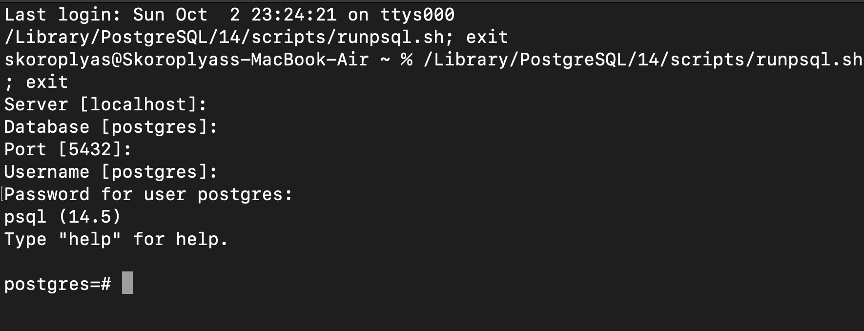 To get started with PostgreSQL, open the SQL Shell. The terminal will ask for parameters for connecting to the database: server address, database name, connection port, username, and password. Press Enter four times, then enter the password you set during installation.
