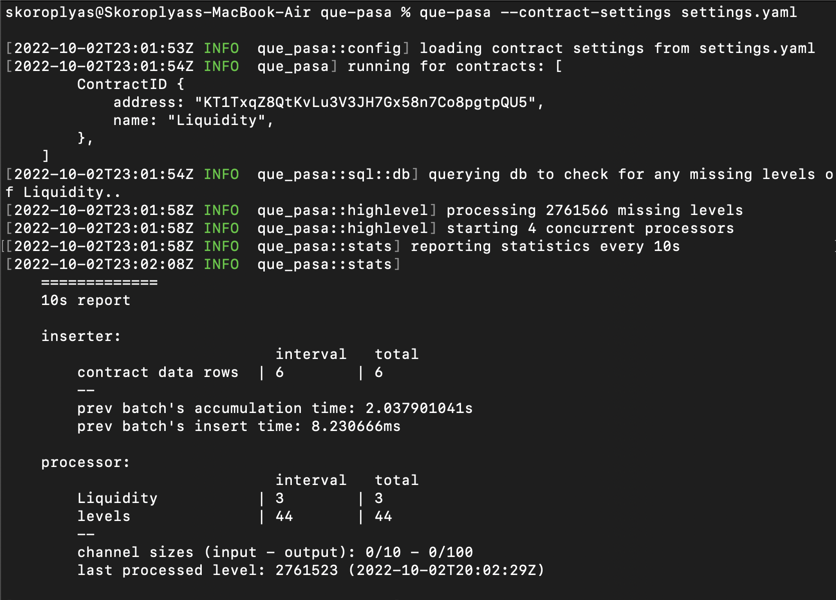 Then, in the terminal with Que Pasa, start indexing the contract with the command: