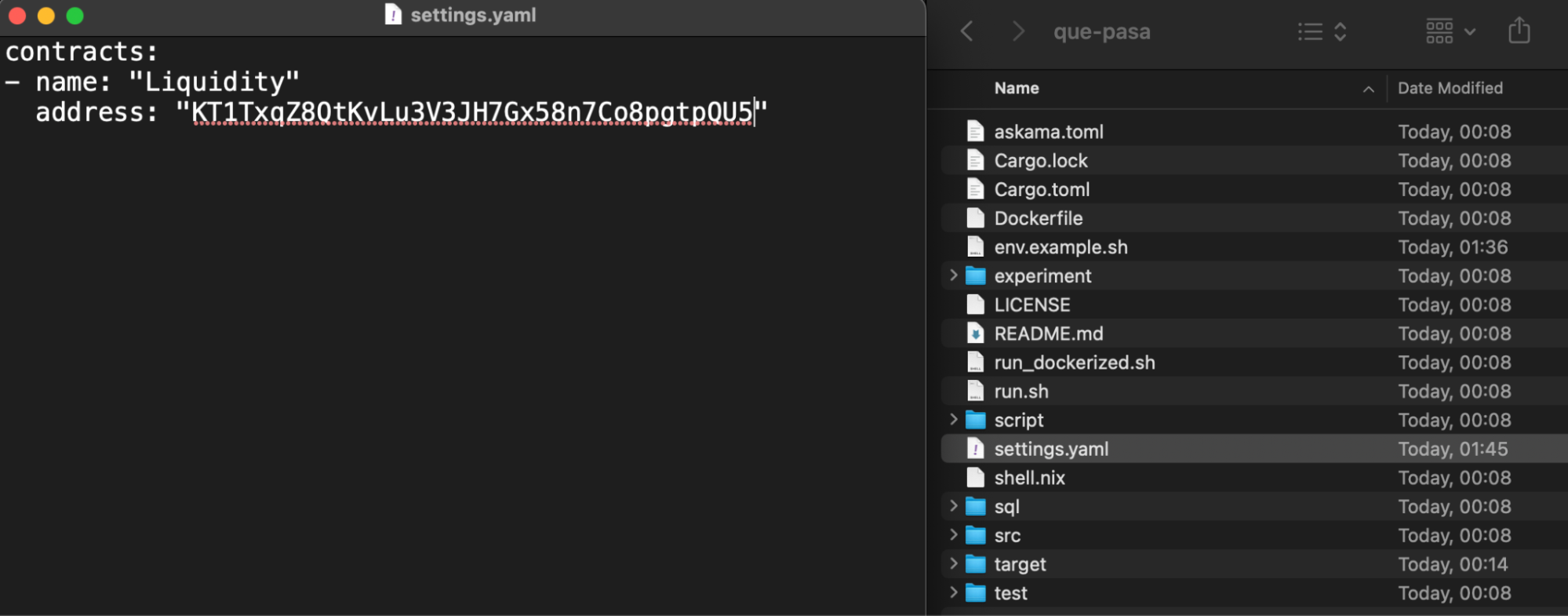 In the Que Pasa folder, open the settings.yaml file and type the contract name and its address. For this project, we will index only one contract, but you can put multiple contracts there.