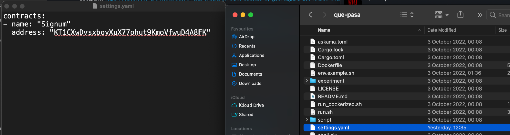 To switch to Signum, you need to replace the database name and contract address KT1CXwDvsxboyXuX77ohut9KmoVfwuD4A8FK in the settings.yaml file.