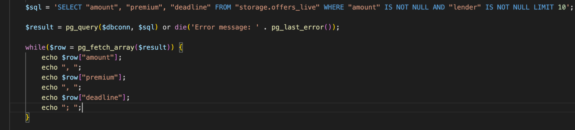 Before requesting data from the database, let's examine the Signum contract store and choose what exactly we will request. The storage.offers table stores data about borrowers' applications: loan amount (amount), loan interest (premium), loan repayment period (deadline), and addresses of the borrower and lender. For example, let's request the loan amounts of several applications.