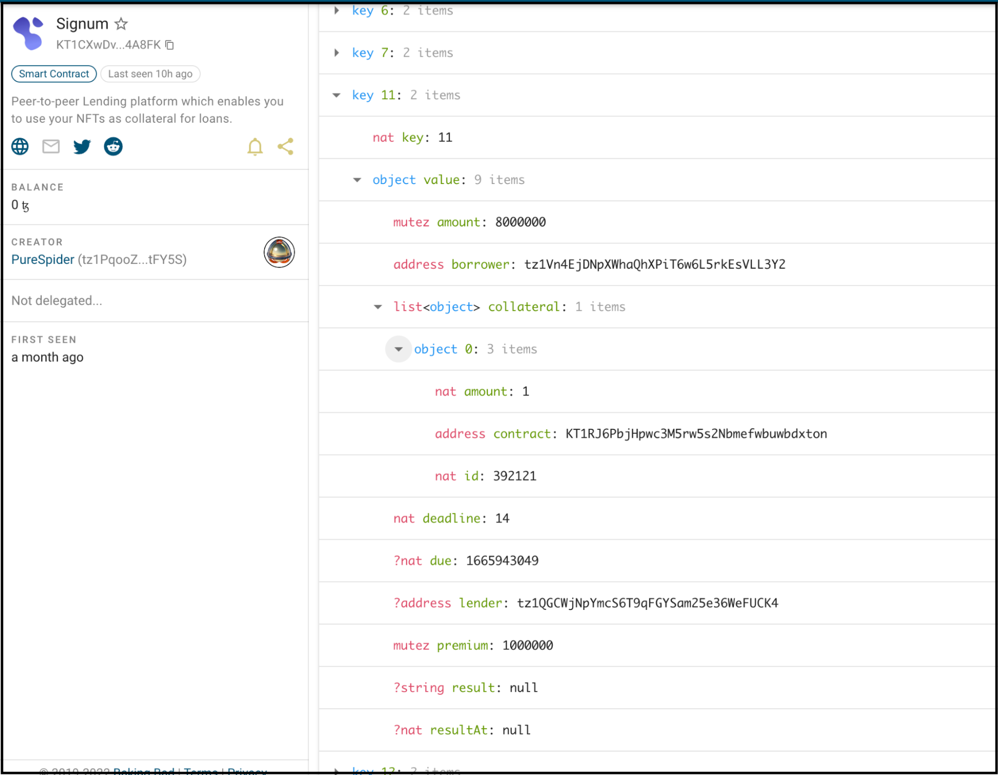 - Explore the contract's storage, especially big_maps. For example, in the Signum contract there is the big_map "offers", where all loan offers are stored. Also, it includes a nested list "object" with info about the NFT in collateral.