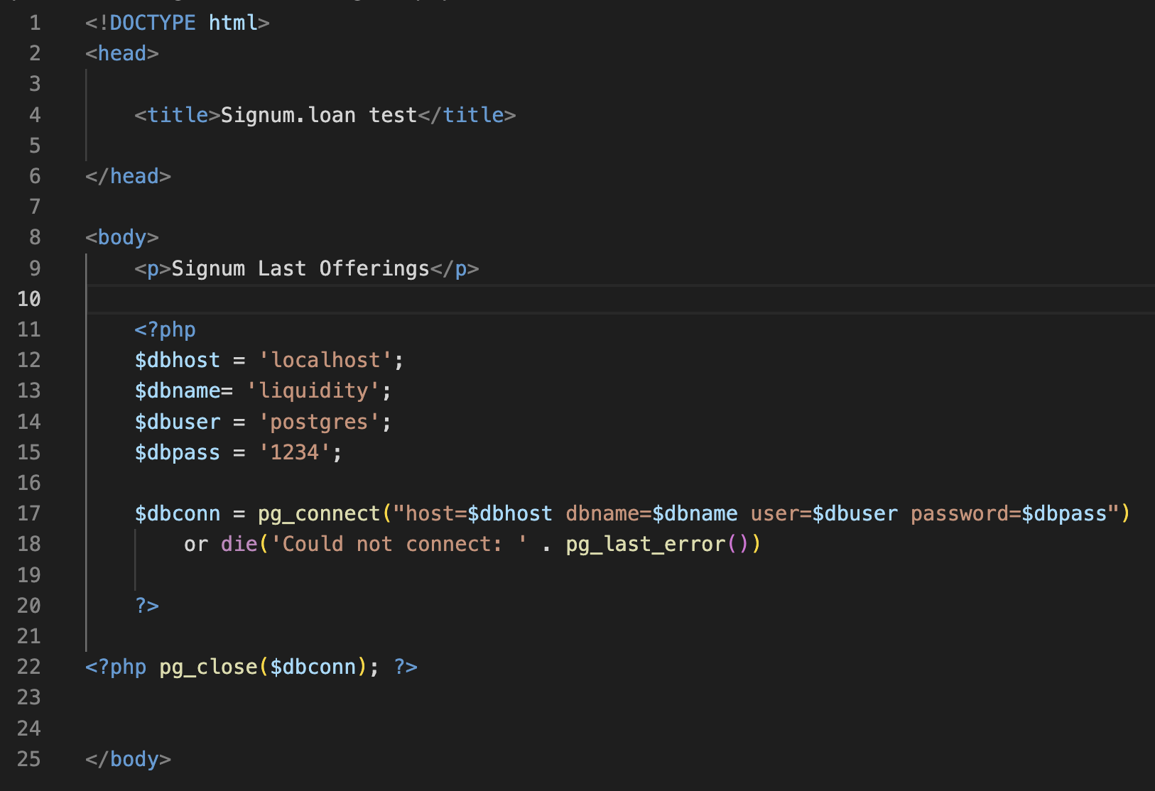 Let's connect to the database. To do this, we set the variables $dbhost, $dbname, $dbuser, and $dbpass with the appropriate values: localhost address, database name, postgres username, and password.