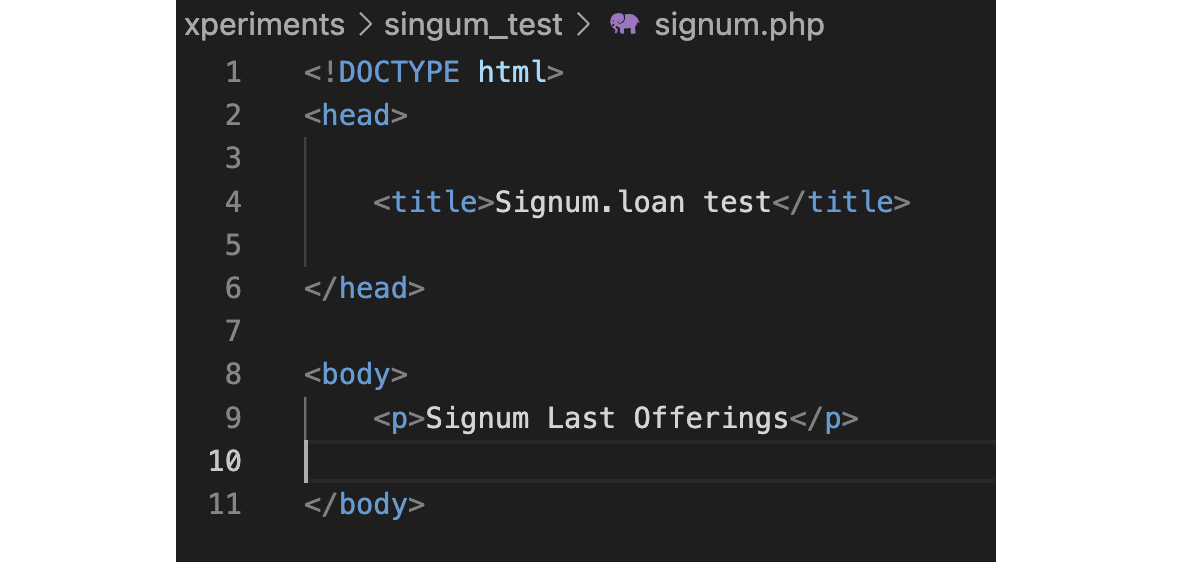 Now you can start working on the page. Let's create a signum.php file in the folder and start writing the code. First - the basics: head, body, page name, and text for the test.