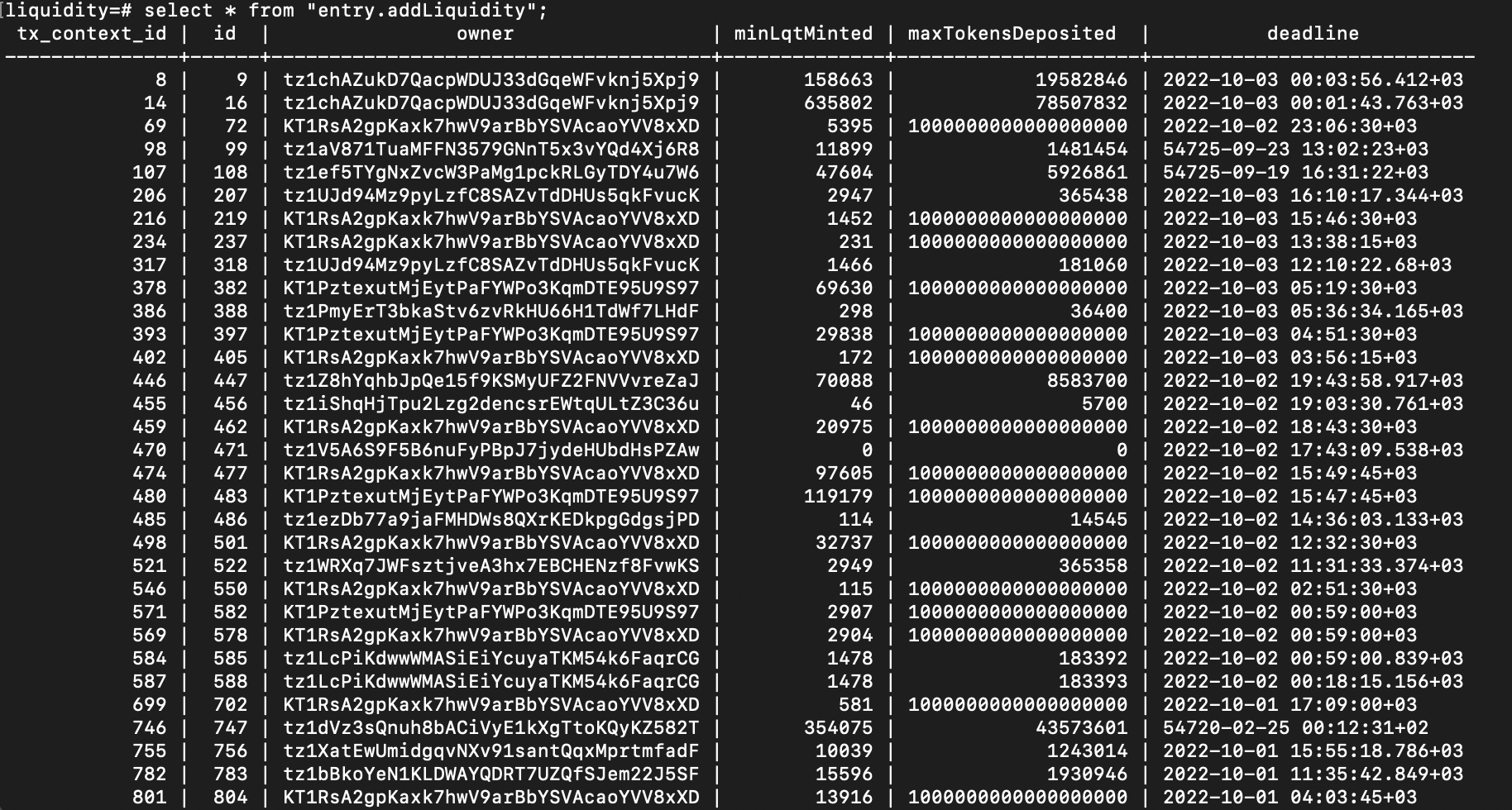 Let's examine the table's contents. Columns like "owner" and "minLqMinted" are self-explanatory, but there are two more columns:
